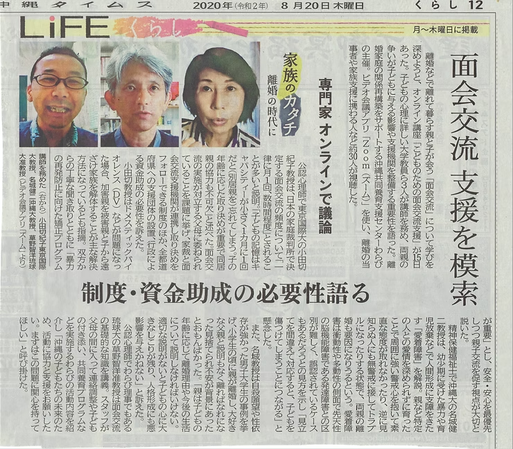 親の離婚に関わる子どもたちが、少しでも傷つきが少なく健やかに成長できるように、わらびは精一杯尽力したいと思います。 今後とも宜しくお願いいたします。 沖縄タイムス 家族のカタチ 離婚の時代に〜面会交流「同居親の協力が必要」当事者ら議論 https://www.okinawatimes.co.jp/articles/-/618906